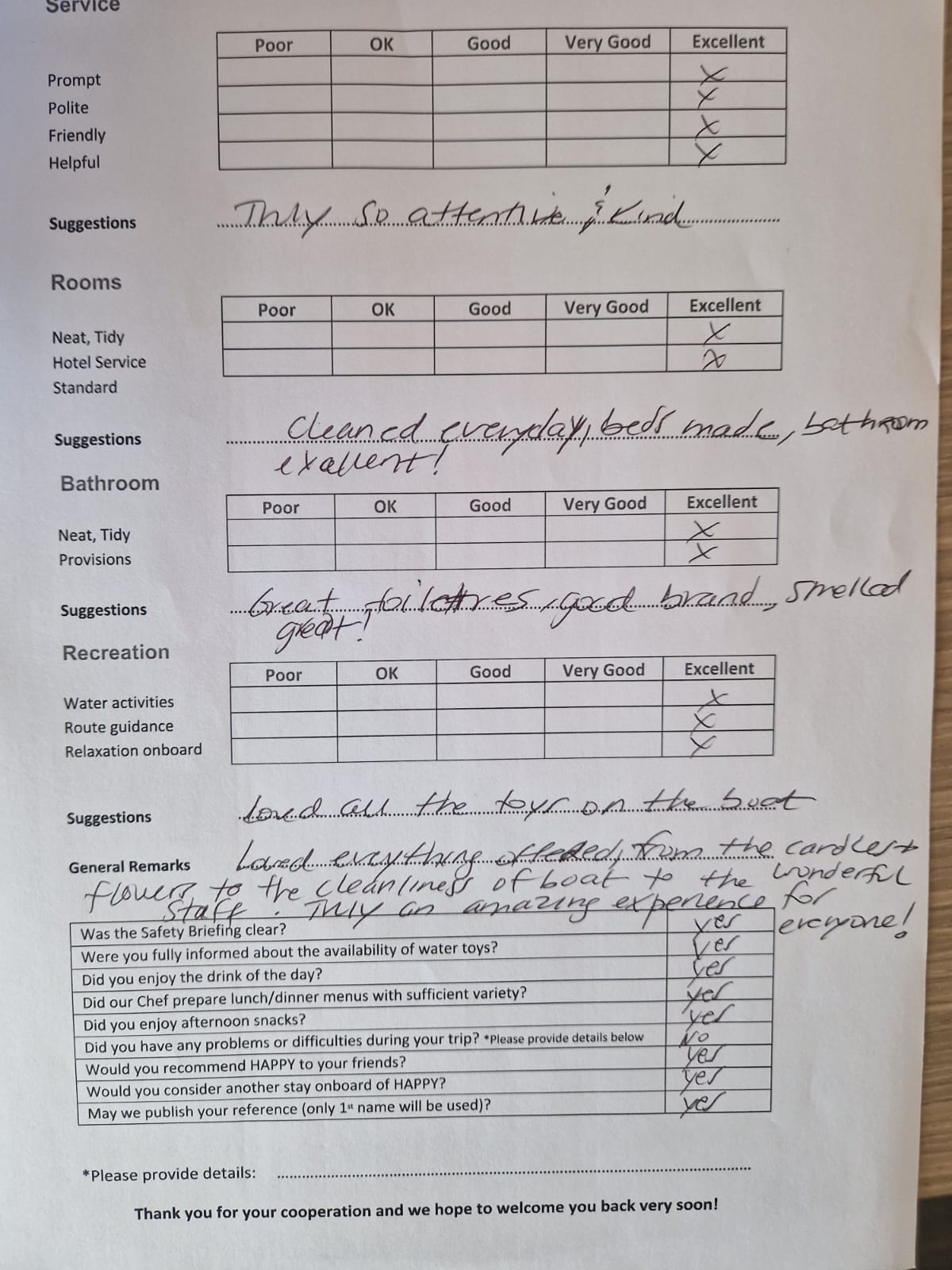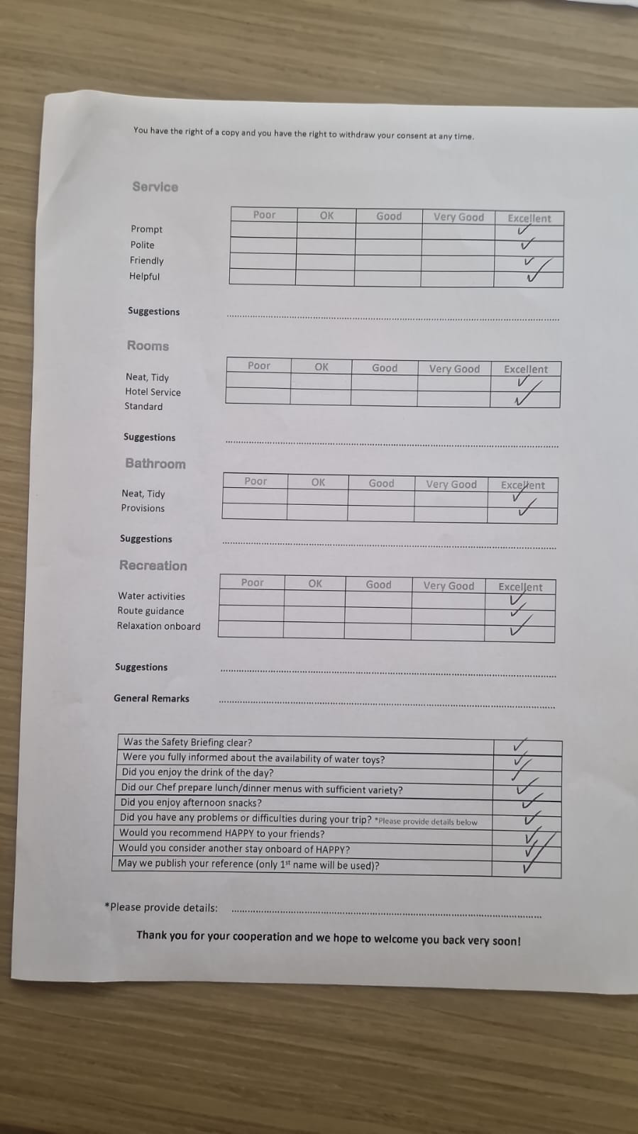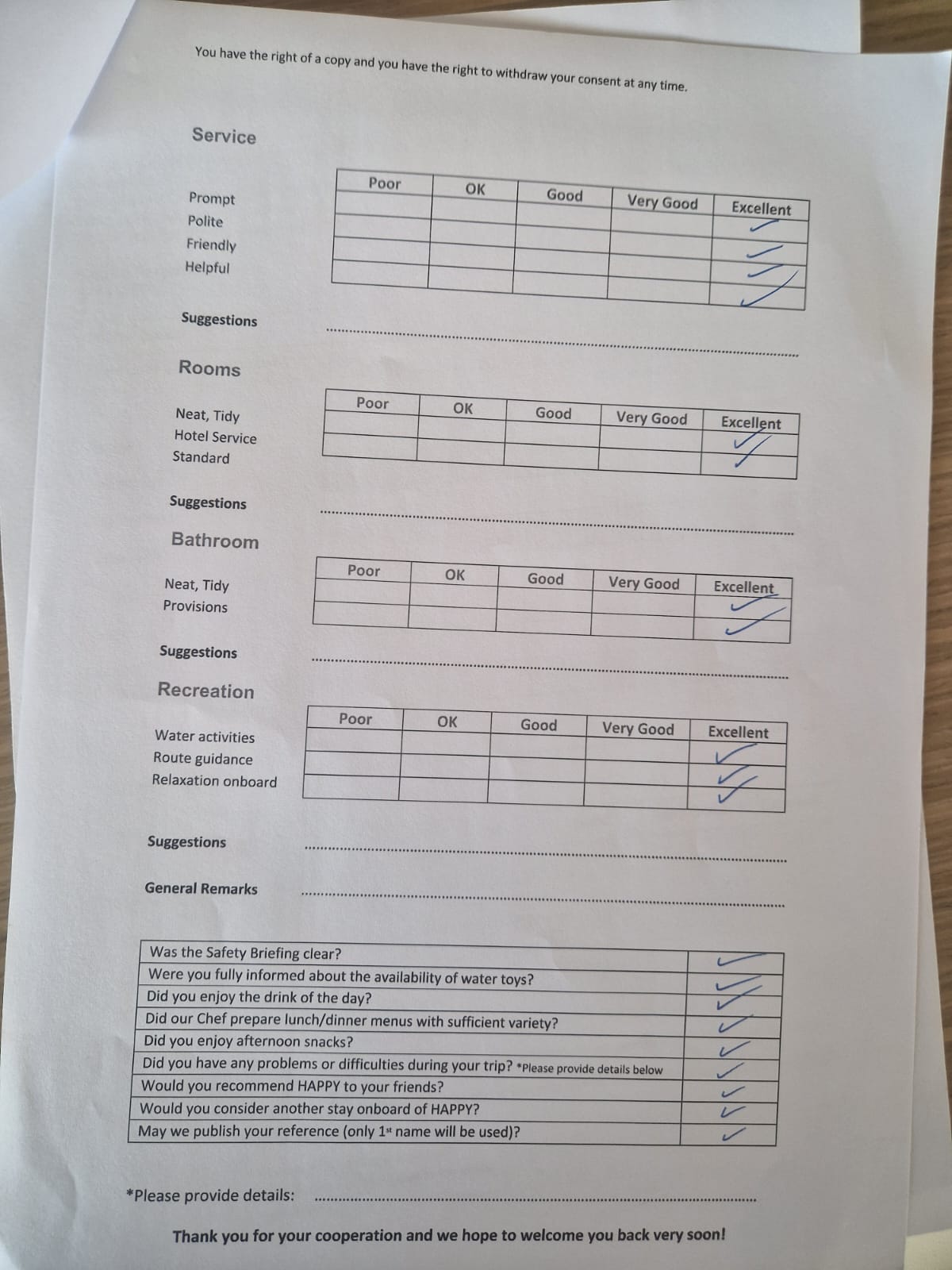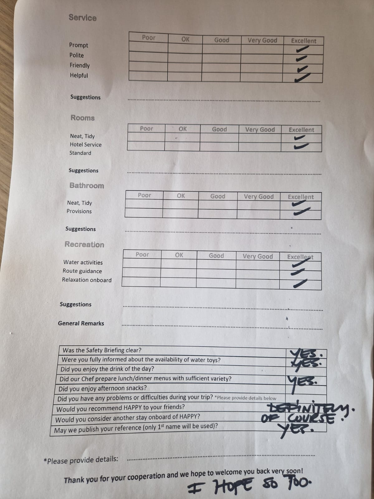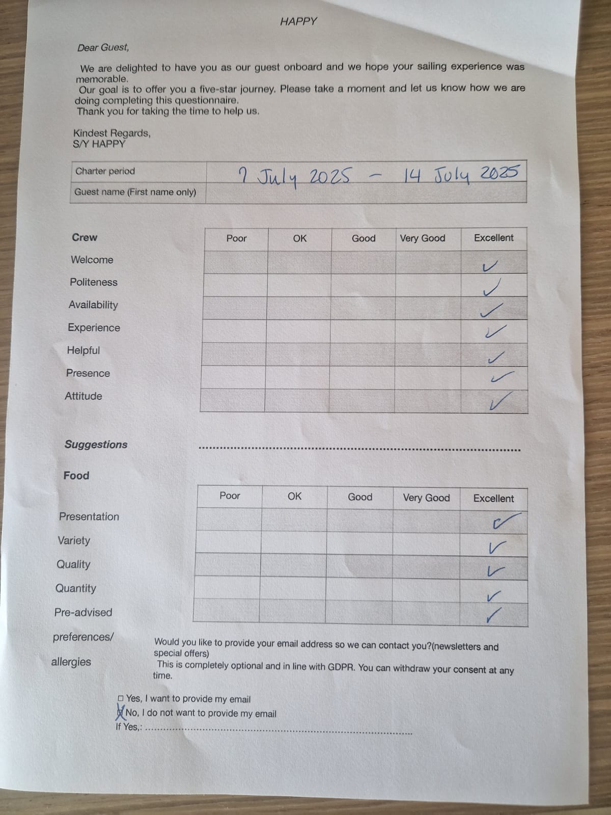 We have all had a wonderful holiday on 'Happy', spending time in the Cyclades and then finishing in the Saronic. The boat is perfect for our family of 5 and we all got the holiday we needed. Sam loved the watersports, the girls loved the placers to relax and sunbathe and Johaan and I just loved the tranquility and the incredible attention and care of our suberb Captain George, we loved it all! George, you are just so good at organising interesting places to visit, places to eat and explanation of where we are going and all of the logistics. The best!