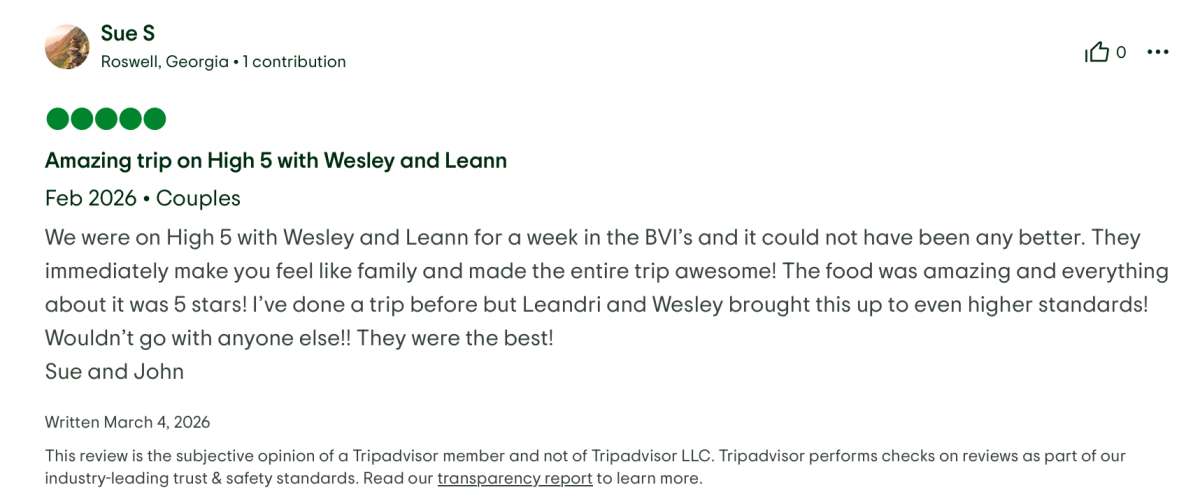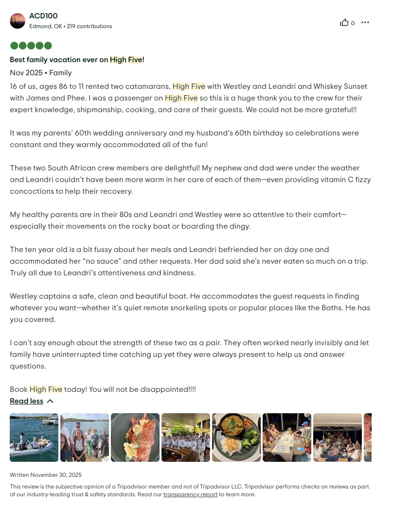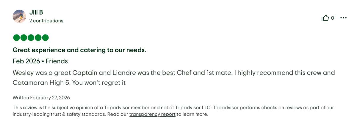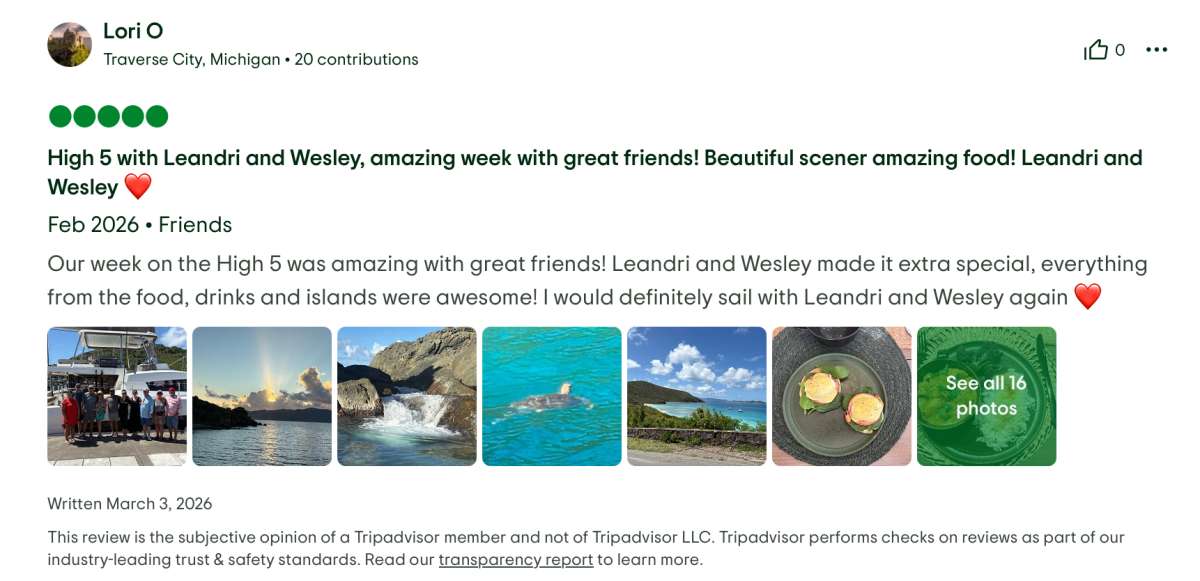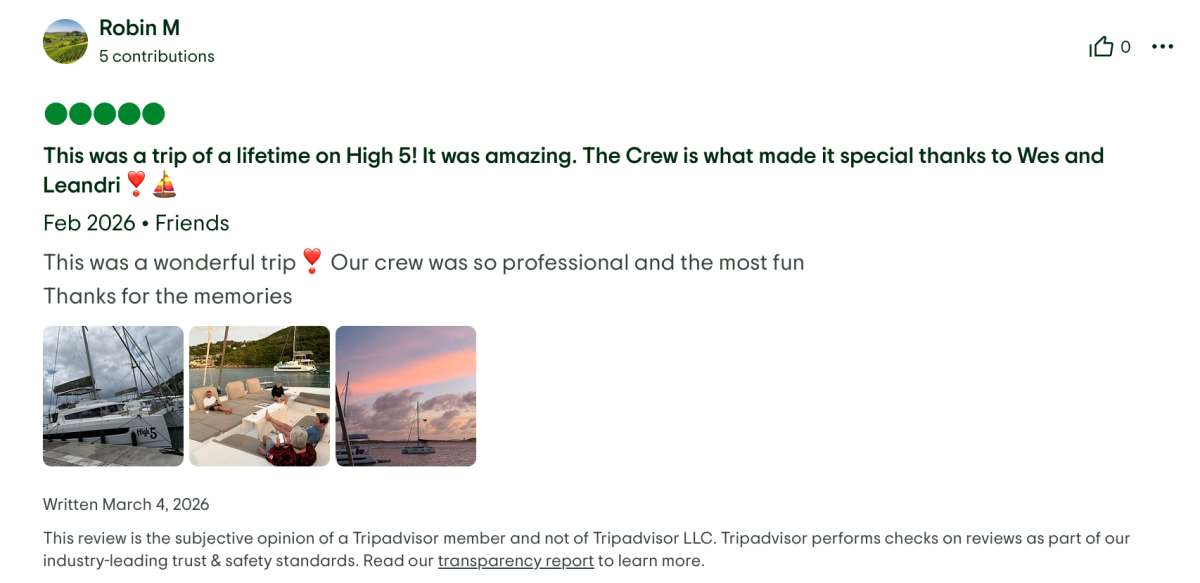 High 5 will accommodate 8 charter guests in 3 spacious queen cabins and 1 sprawling master cabin for those who desire more space. She is a 2023 sailing catamaran offering Starlink, 70 HP tender, a hard top, hydraulic lift, SeaDek, solar panels, air conditioning, water maker, ice maker, full sized refrigerator, a fully customizable menu, ecofriendly and reef safe toiletries, a bar stocked to guest preference, coffee/espresso machine, rendezvous scuba diving, snorkeling gear, underwater scooters, subwing, wakeboard, 2 stand up paddle boards, 10 ft. floating dock, pool noodles, fishing gear, board and card games, television in the salon, Fusion 3 Bluetooth enabled sound system and High 5 giveaways.
