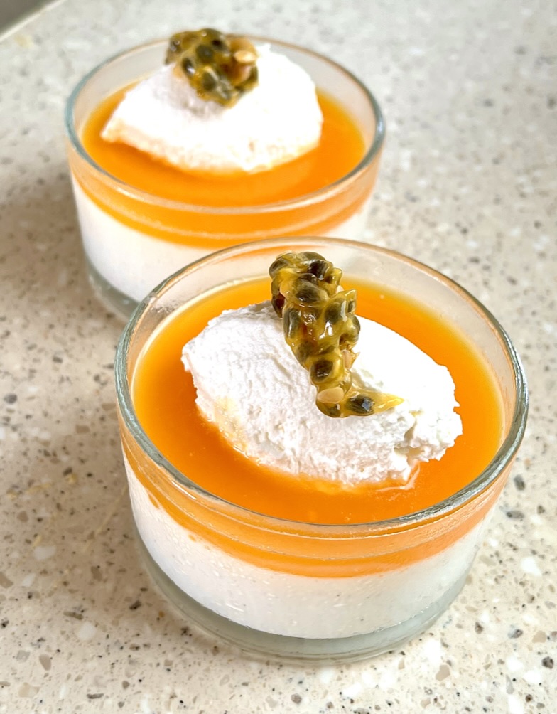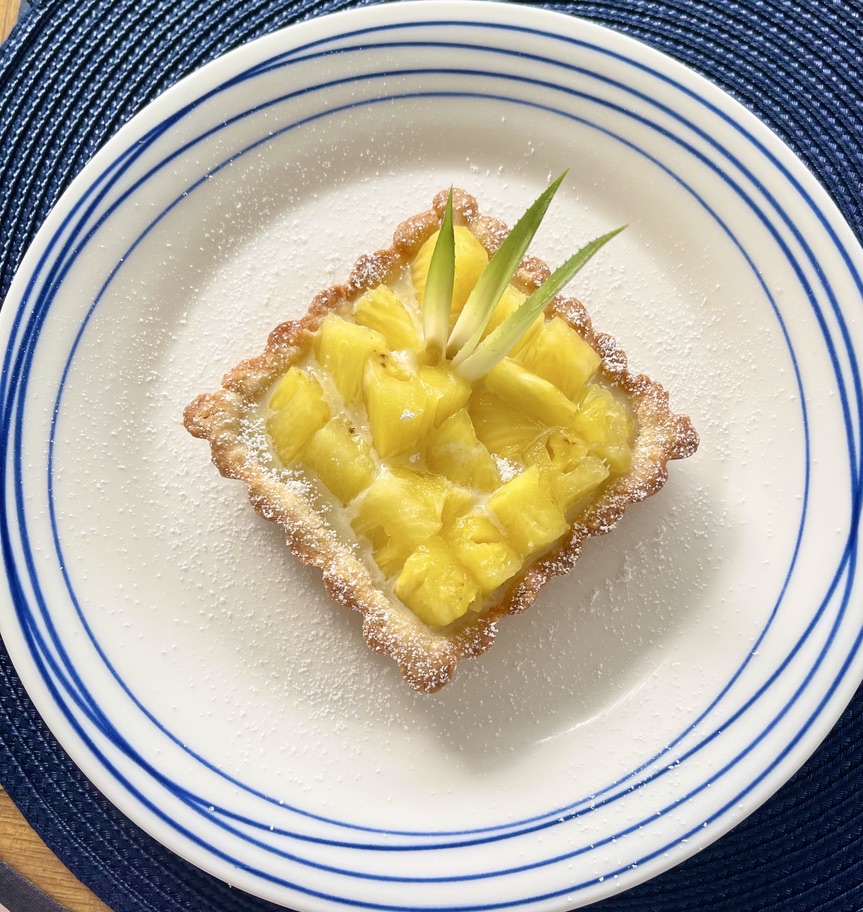 Coco-lemon shortbread topped by bananas on spiced syrup