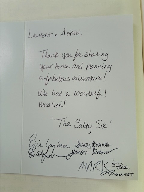 Astrid & Laurent, Too many thank you to list. Your unending hospitality was so appreciated. To go on a vacation and truly relax and be taken care of is a dream. To have that happen in the hands of such accomplished people - a pure treat. Getting to know you as friends and having the opportunity to experience a bit of your current life - pure joy. You both welcomed us into your home as strangers, but ended as friends.We will figure out a way to take another trip under your care again. The experience was delightful, the good superior, the governing of the boat so competently organized, all the pieces created a very memorable vacation - one we will talk about for years. Thank you both. I truly hope our paths cross again.Happy sailing Lynn