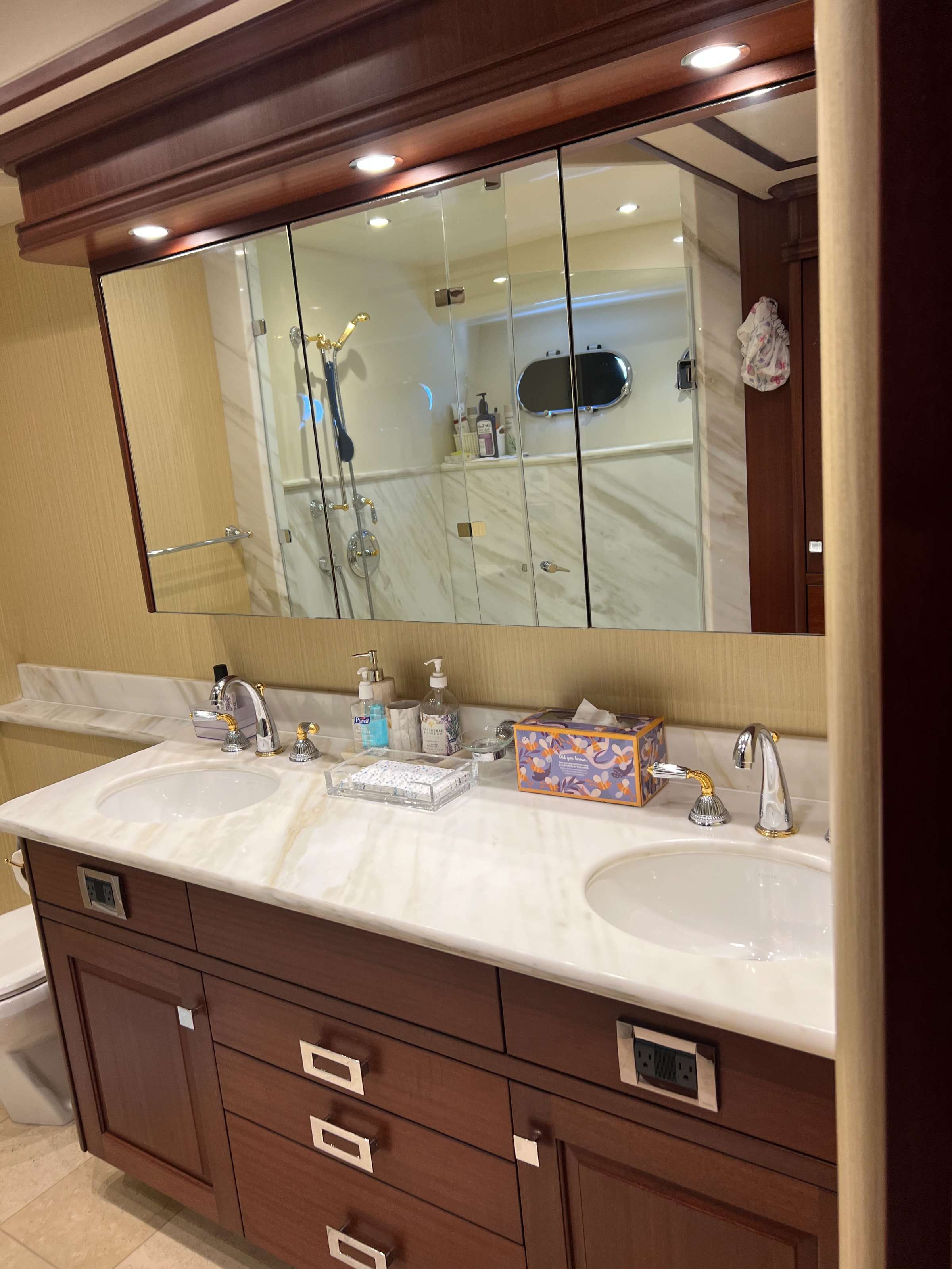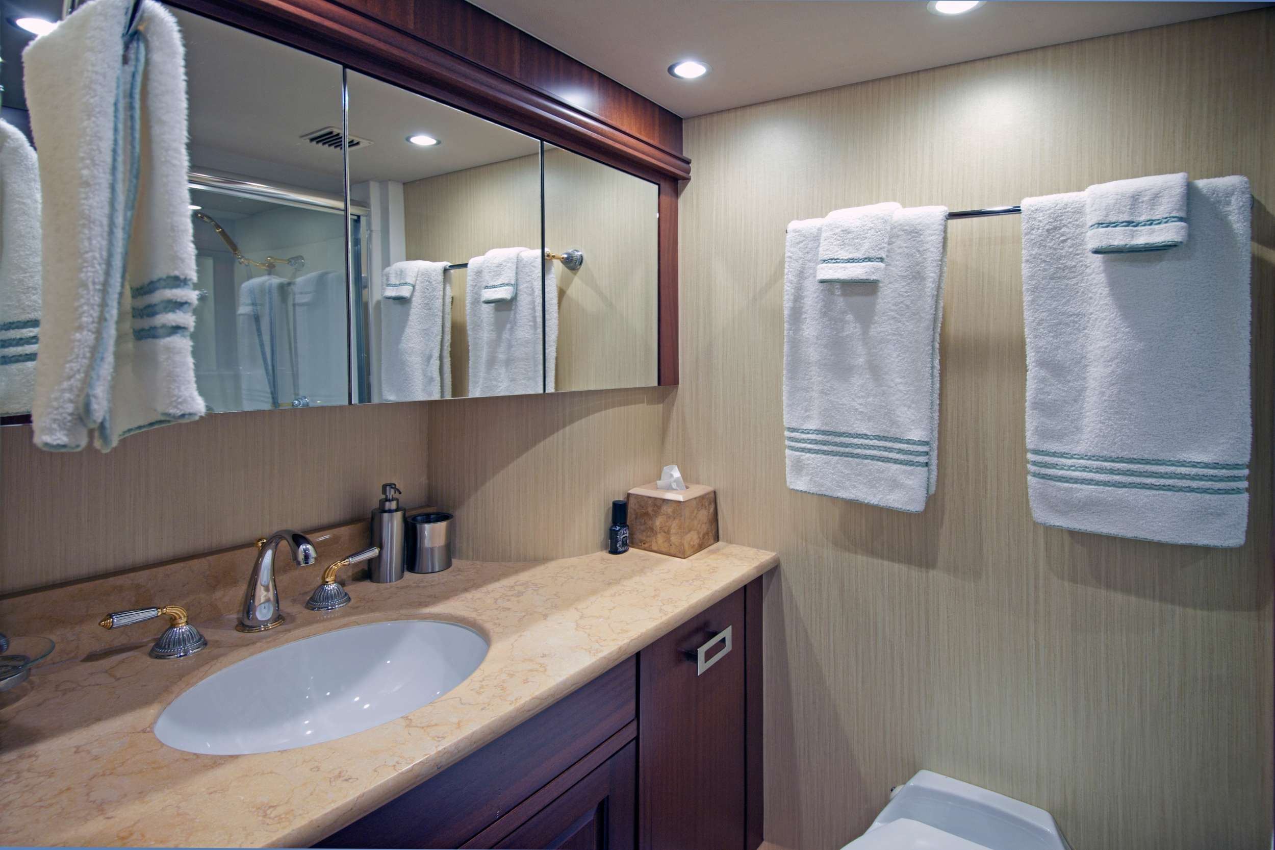 Accommodating up to 8 guests in 4 beautifully appointed staterooms, KATANA offers a full-beam master suite amidships, two VIP cabins, and one twin—all with en-suite bathrooms and refined finishes that reflect her classic American yacht styling. Natural light flows through large windows, enhancing the serene onboard ambiance.