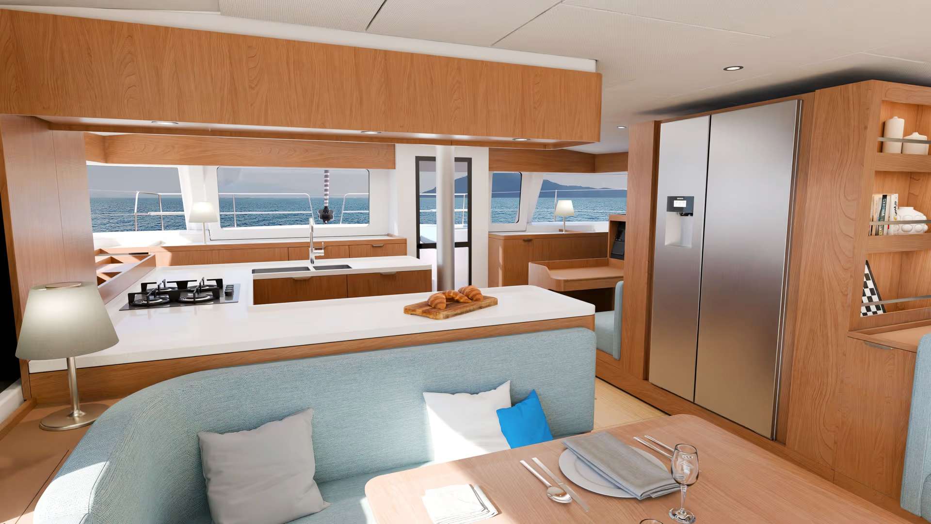 'KOS 52.CAT3' is a Sailing Catamaran, accommodating up to 12 guests, available for crewed charter with a home base in Lefkas D-Marin.