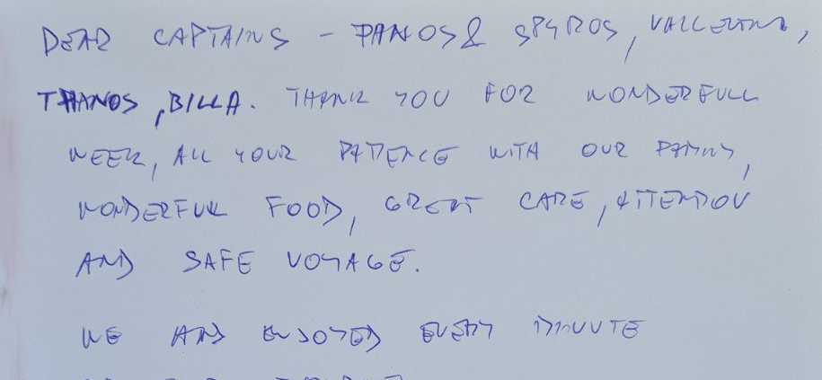 Dear Captain Pavlos, Tanya, Vassilis and Apostolis,We thank you for the most wonderful week, which would not have been so wonderful without such a lovely, friendly crew. The food was wonderful and we are so grateful that all our food preferences we were so carefully covered for. It is never easy cooking for people who can cook and grow their own food, so have high expectations but Apostolis succeeded.