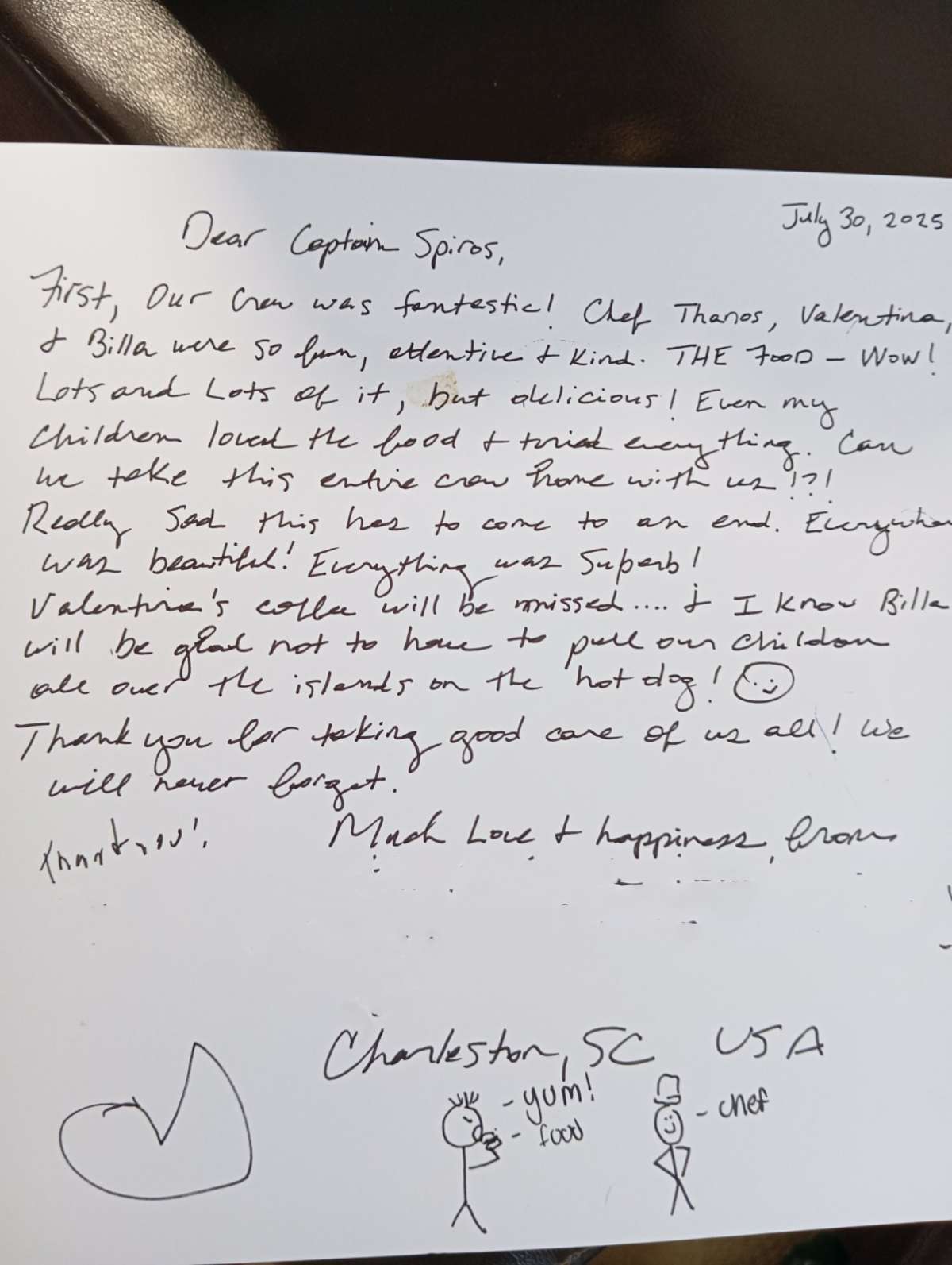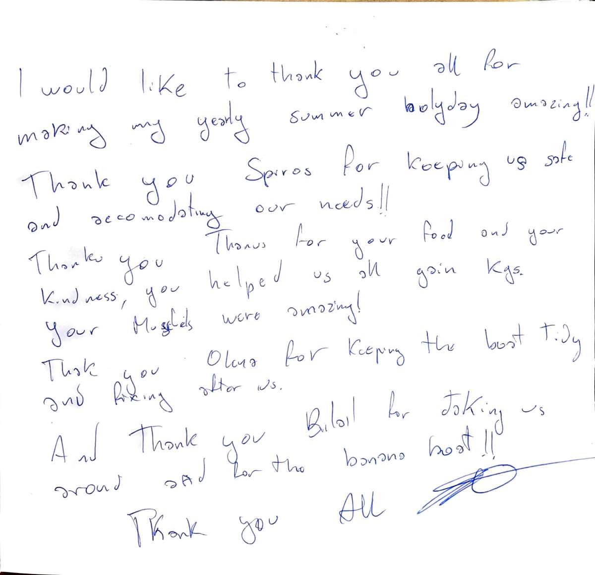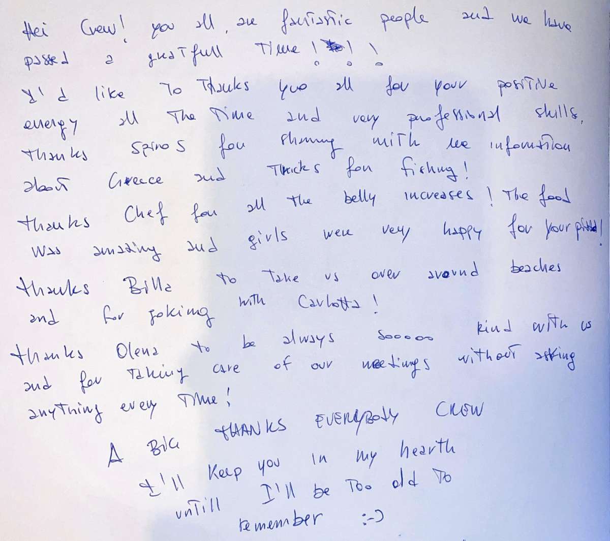 Dear crew, we end our trip drenched in sun, filled with amazing food and happier than ever!!!!!We knew Greece would be amazing but thanks to you.