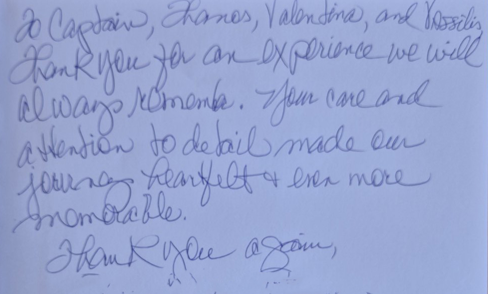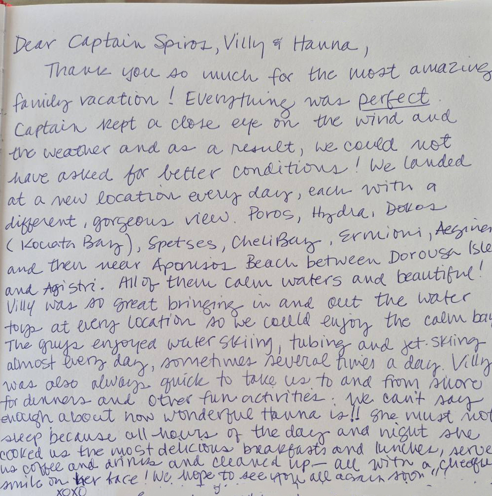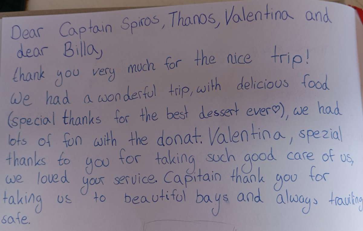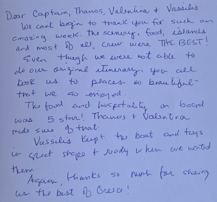 Thank you all so much for a wonderful week on board. We were all very comfortable and happy. The crew was fabulous. Captain, thank you for taking the extra time and effort to explain the places to us, making us more comfortable selling your beautiful country to our clients. Chef, thank you for the fabulous food and for giving us the traditional Greek food experience. Billy, thank you for always having a patient manner and for waiting for us when we want to swim in the very fresh water. Mila, thank you for your service and kind nature You did a great job with summer.