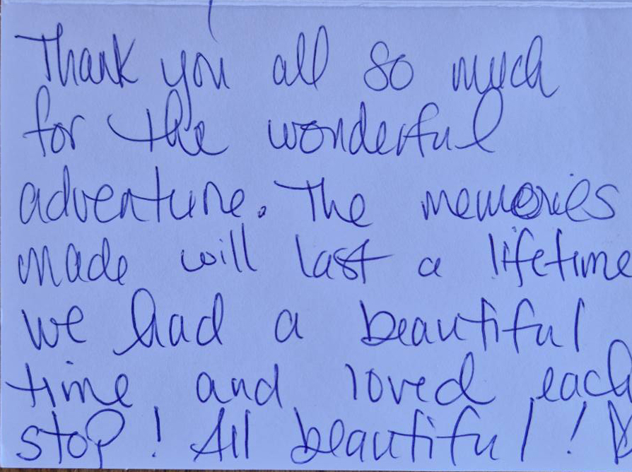 You are wonderful people and your taking care of us was exceptional..