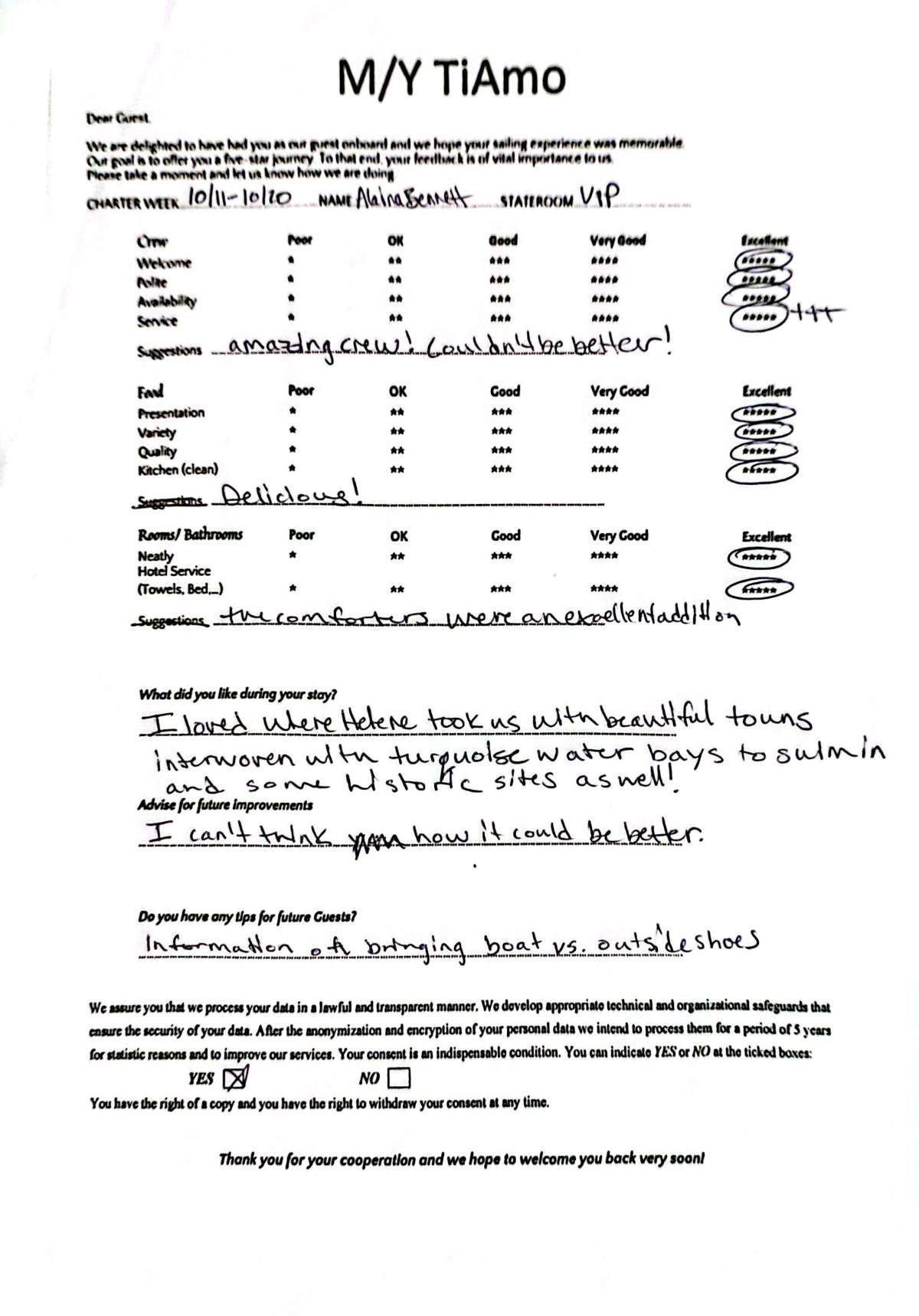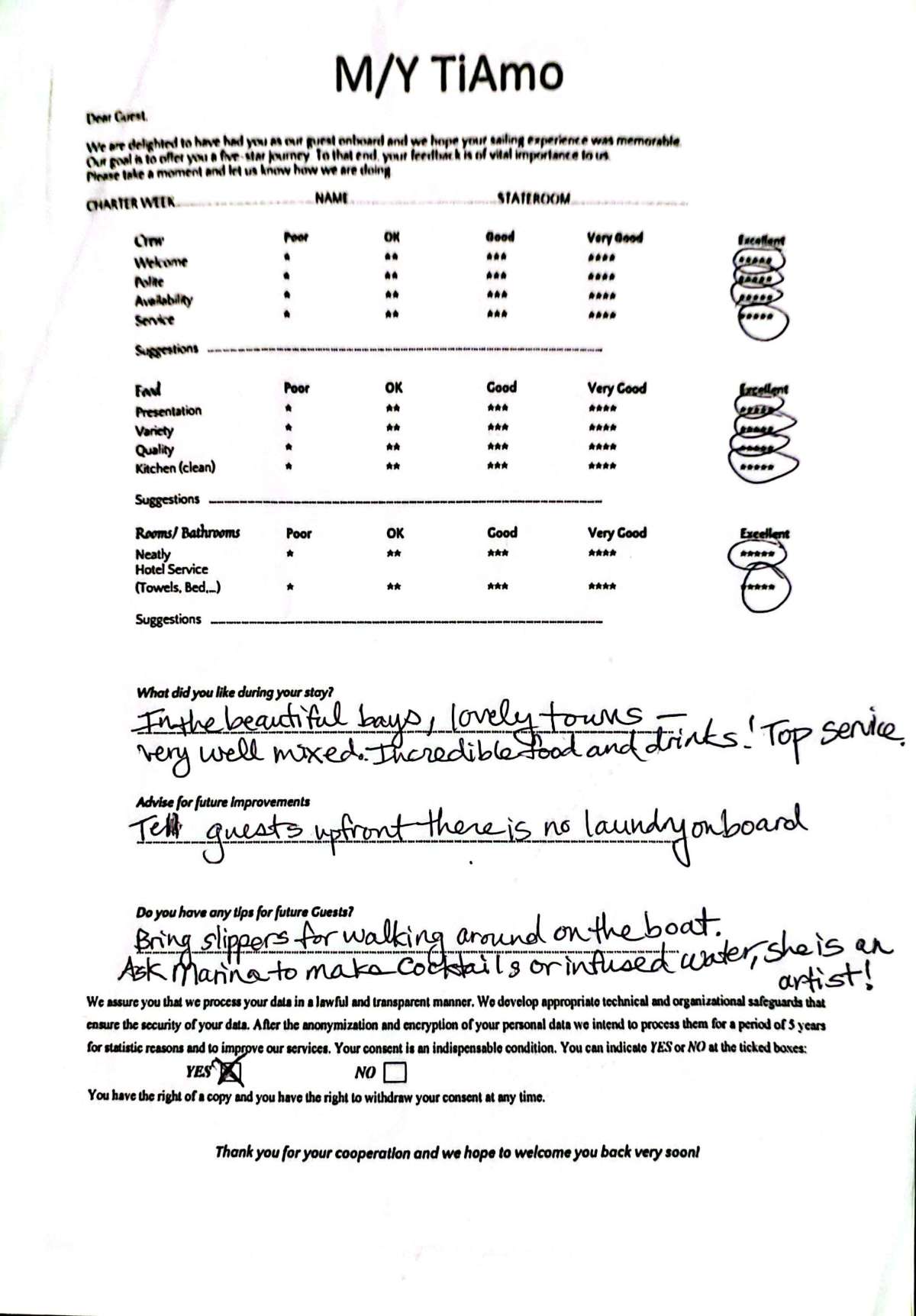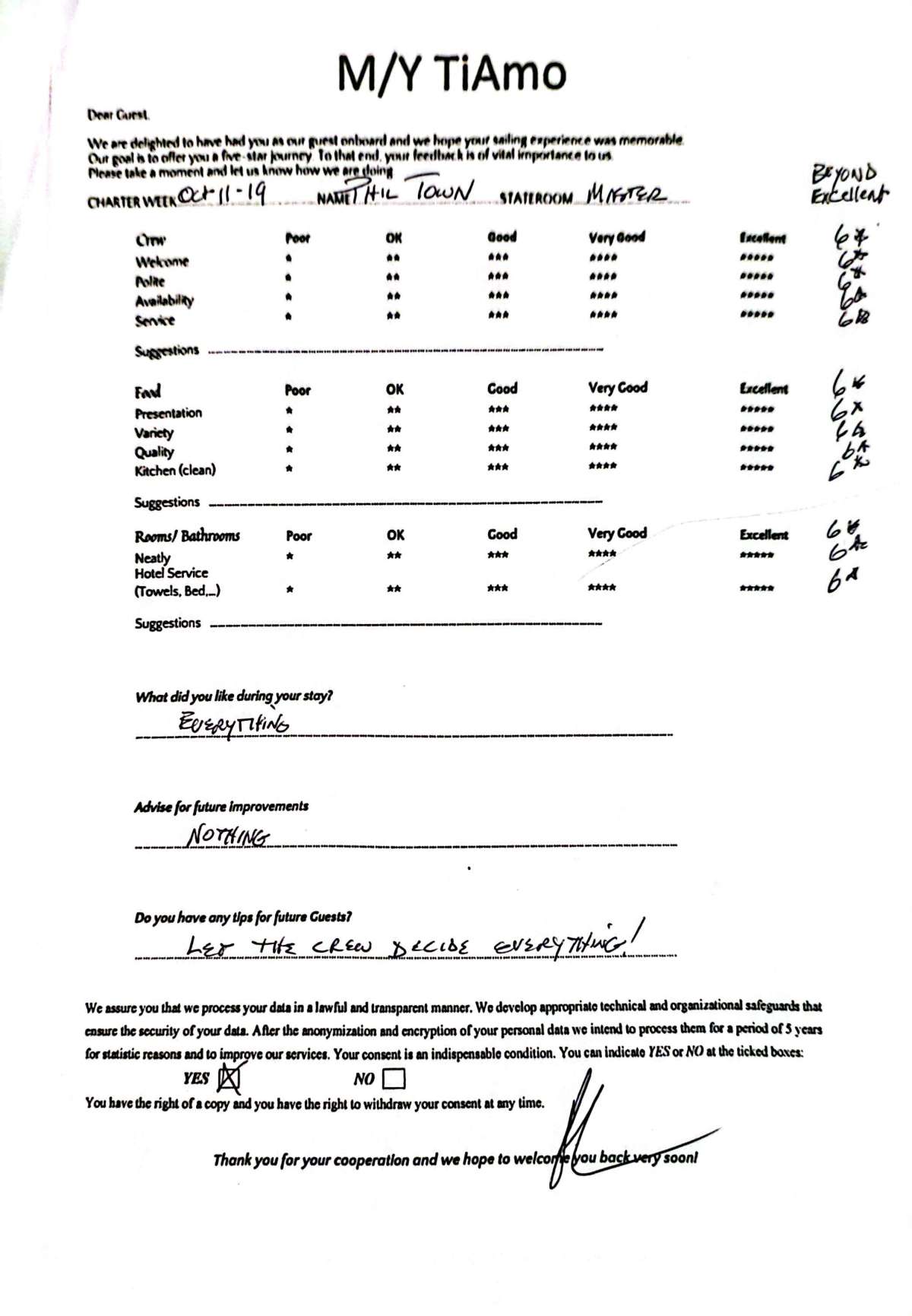 "What a successful charter we just had on TI AMO - I adore this crew, they are so wonderful, the client could not have been happier so thank you for making this last minute booking such a success as always!"Sarah