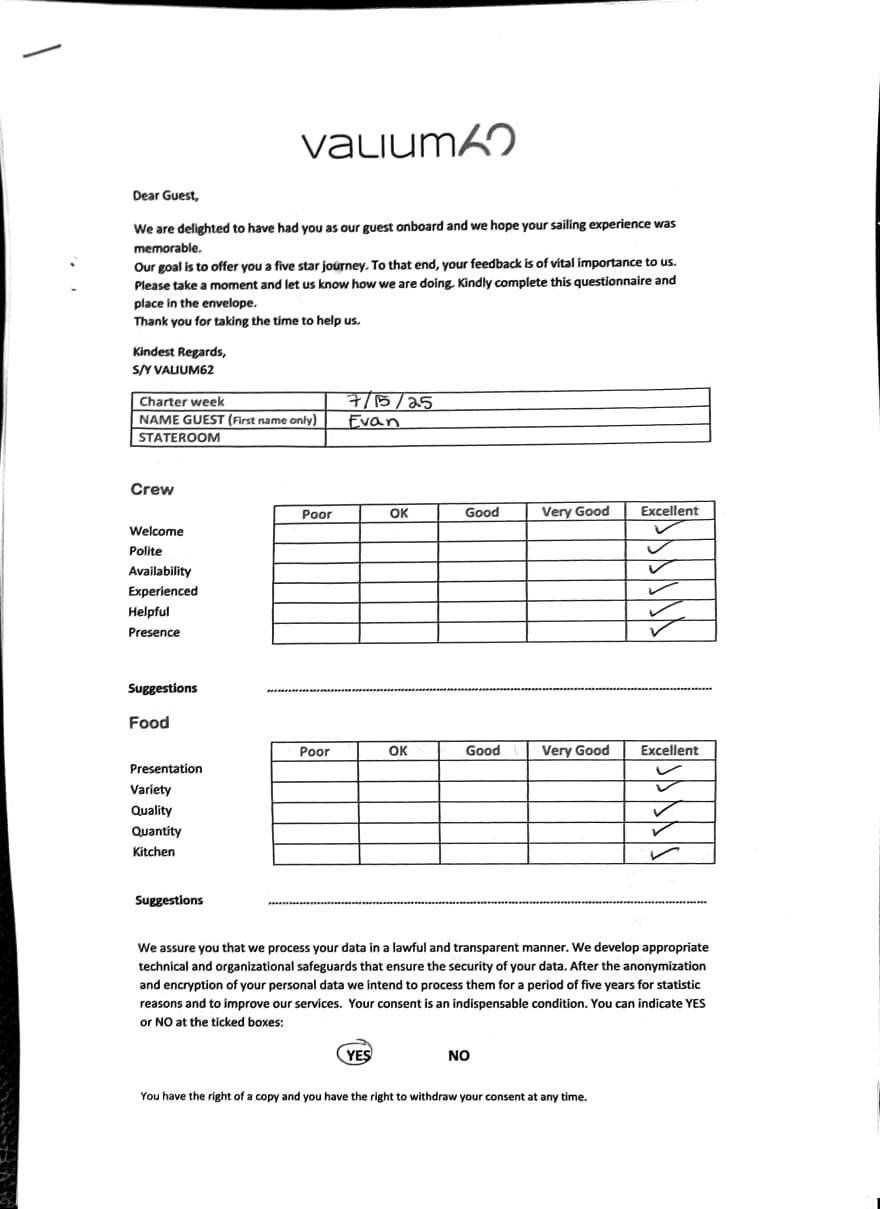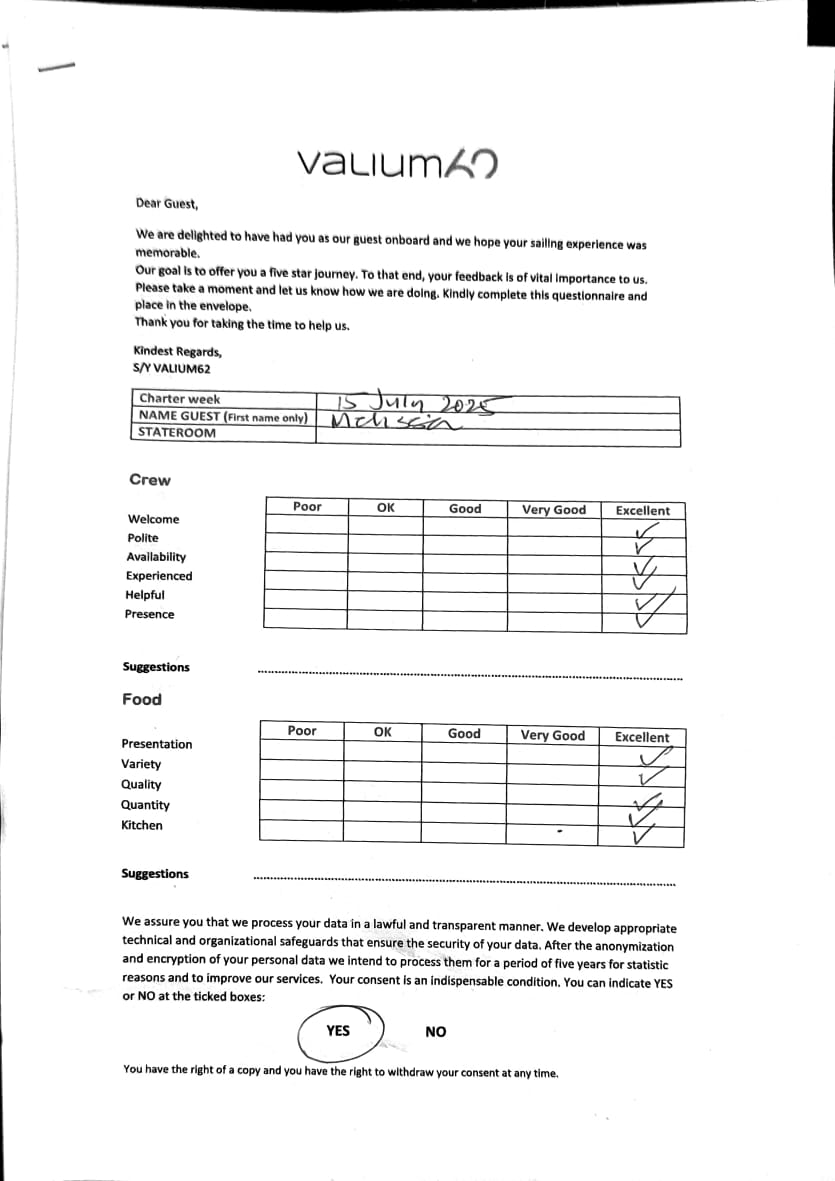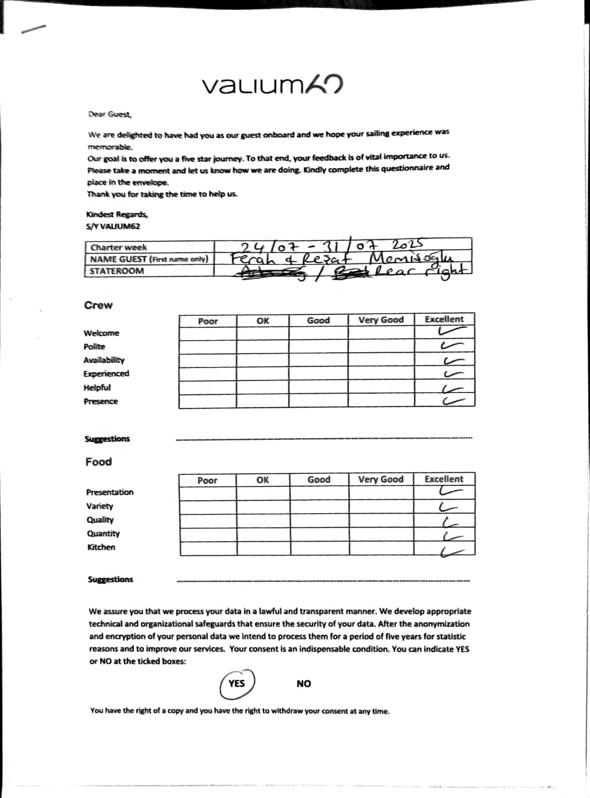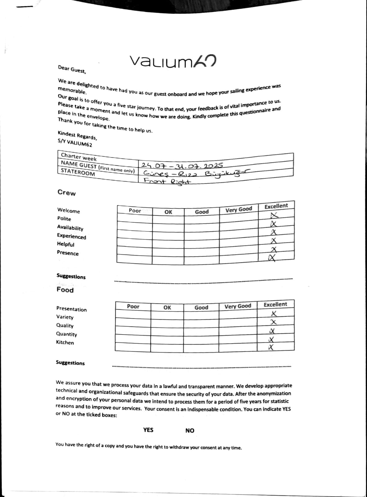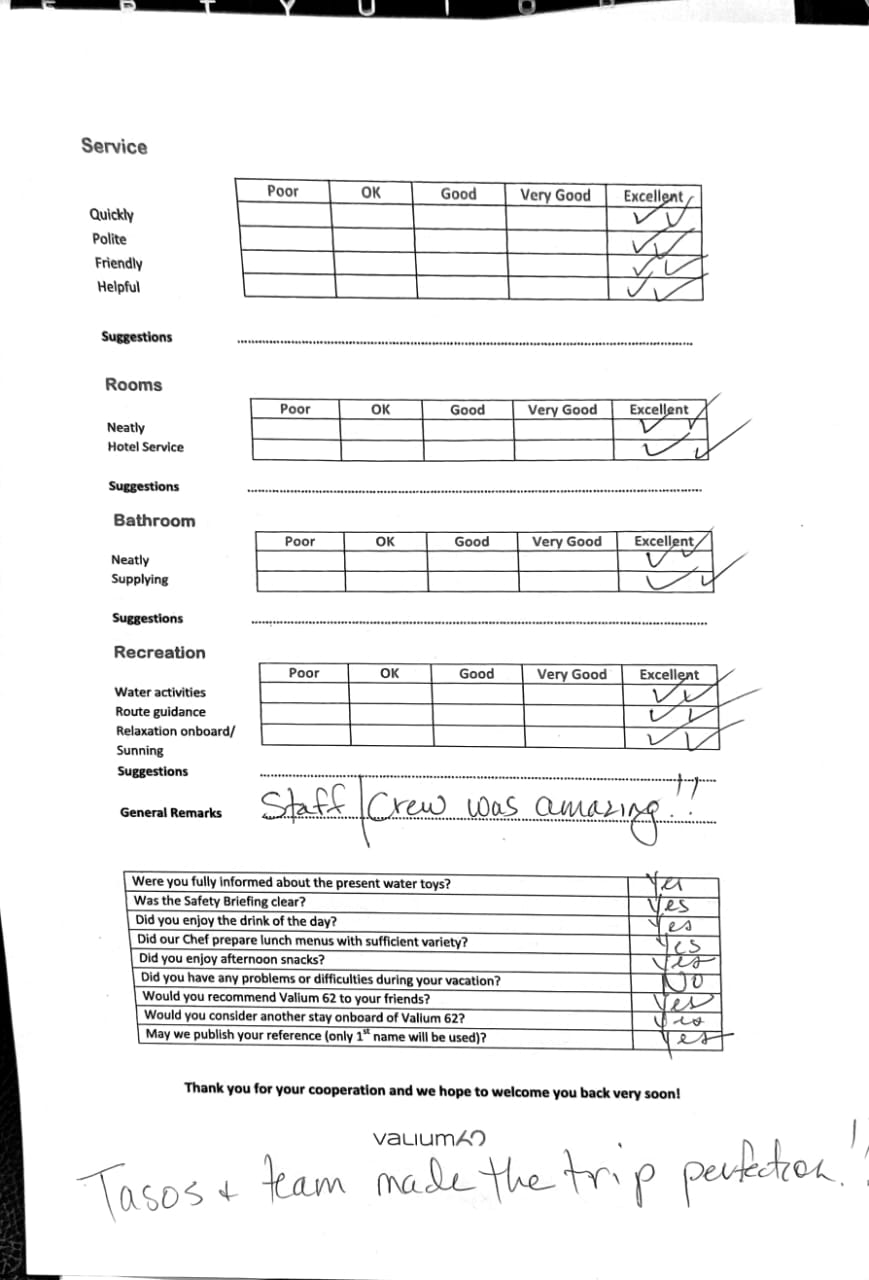 Thank you for making our trip absolute perfection! This holiday was amazing due to the crew of Valium 62. This holiday was nothing less than 5 star service from each meal served, every coctail and every perfect cove selections that we would never have been to if it wasn't for our captain. This week was a dream! Memories for a lifetime! We are forever grateful for your hospitality and opening our souls up to proper Greek culture. We are excited to book our next trip with you. We will be back!19th July to 26th July 2024